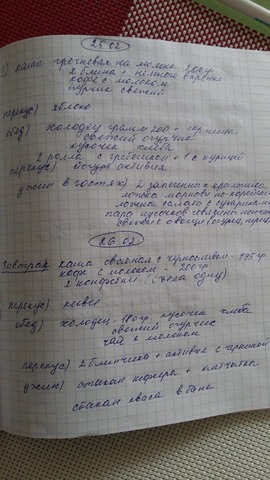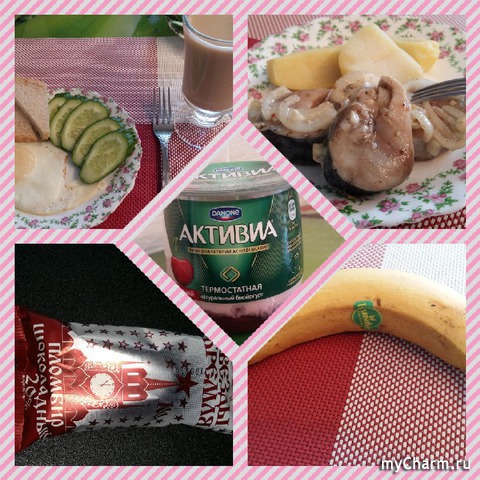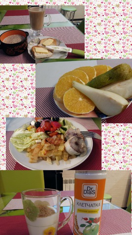Утром кашу гречневую на воде. В колледже в 11-00 обед- два салата, бульон от супа, кисель. Кекс отдала преподу.))ДОма в 5 съела 2 морковные котлетки и хлеб с вареньем. Пила воду.Пока всё.))