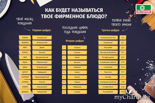 Всё, что Вам нужно, это выбрать из столбца сначала Ваш месяц рождения, далее последнюю цифру года рождения и первую букву Вашего имени. Соединив их, Вы получите индивидуальное название для Вашего фирменного блюда!