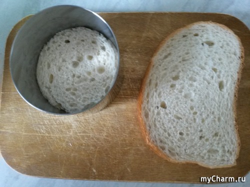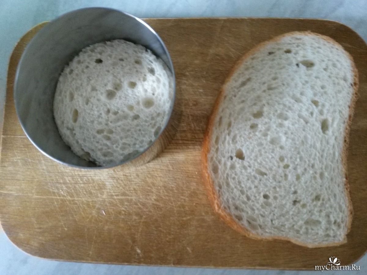 Из ломтиков булочки вырезаем кружочки, так чтобы они были по размеру кольца, это будет подушкой для омлета