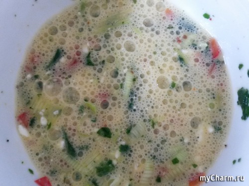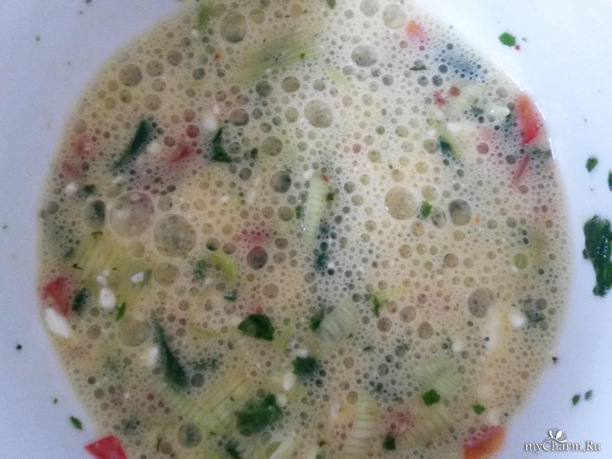 В яйца добавляем нарезанные овощи, шпинат можно свежий или замороженный, взбиваем венчиком до пышной пены