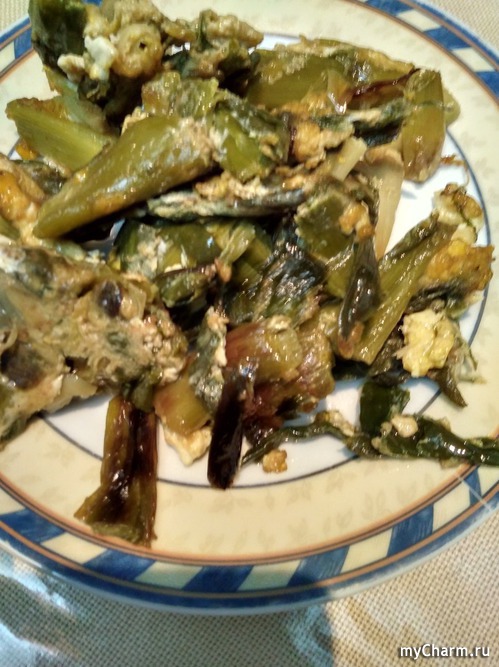 Нормально напишу как делать.берешь стебель очишаншь от верхних листьев.осиавояешь где то около 25-30см от всего стебеля.листья и режешь на кусочки 5см.отвариваешь.сливпешь..Обжариваем и заливает яйцами.усе