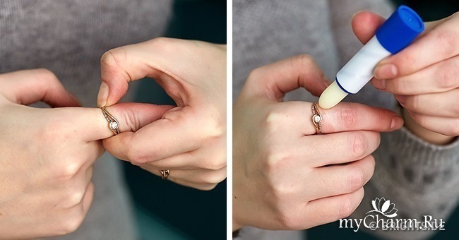Бывает, что кольцо становится мало, а снять его уже не так просто, как надеть. Первое, что приходит в голову, — это мыло, но не спешите бежать в ванную, просто воспользуйтесь вашим бальзамом для губ. Смажьте кольцо со всех сторон, и снять его станет намного легче.