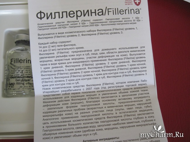 Состав препарата Fillerina может похвастаться наличием низкомолекулярной гиалуроновой кислоты и уникального пептида с интересным названием Матрифулл (Matrifull), способствующего активизации выработки ценнейших компонентов дермального матрикса и отвечающего за стабильный и продолжительный результат. А низкомолекулярная гиалуроновая кислота славится своей уникальной способностью связывать воду и надежно удерживать ее впоследствии в клетках кожи. В препарате Fillerina гиалуроновая кислота представлена шестью разновидностями, направленными на коррекцию того или иного круга проблем. Невысокая молекулярная масса позволяет частичкам гиалурона без особого труда достигать дермы и эффективно заполнять глубочайшие слои кожи, что в свою очередь дает возможность разгладить любые неровности и хорошо заметные морщины, справиться с обвисанием кожи и сделать губы и скулы более объемными.Все компоненты, входящие в состав препарата Fillerina, гипоаллергенны и могут похвастаться абсолютным отсутствием противопоказаний (как в комплексе, так и самостоятельных).