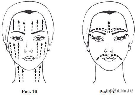 2. Начинаем производить похлопывания по лицу: от подбородка к волосистой части головы. Начните с легких похлопываний подушечками пальцев, затем перейдите на похлопывания фалангами пальцев затем – ладонями. Выполняйте похлопывания 1–2 минуты до легкого покраснения кожи по линиям, показанным на рисунке 16.