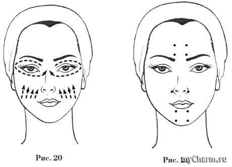6. Теперь делаем точечные надавливания по линиям скул и вокруг глаз. Начните с коротких надавливаний, продолжительностью 1 секунда, затем постепенно увеличьте время надавливания, на одну точку до 3 секунд. Надавливания производите по линиям, показанным на рис. 20, в течение 2 минут.