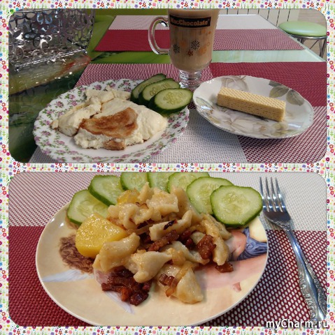 Ужины - ммм, как сказать... Ужин был только один раз - в пятницу. Должна была прийти старшая со своим Сашей, я сделала сырники. Вот и съела за компанию три штучки с небольшим количеством сметанки и варенья (где-то по полложечки на сырник). В субботу сырники нагрела на завтрак в микроволновке. В воскресенье на ужин была чашка молока.