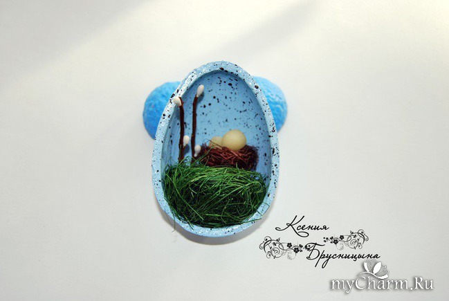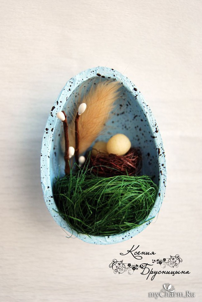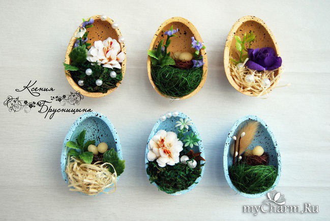 мне кажется, что таким же образом можно сделать в половинках яиц, половинках скорлупок. приклеенных на основу. или на пластилиновую ножку.