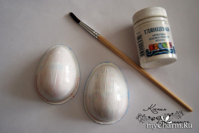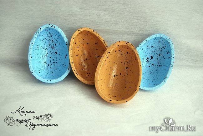 грецкий орех пополам можно, но это будет миниатюра. Скорлупу пополам не выйдет, но ей можно выложить формочки, вылепленные из теста или глины. Сейчас продаются силиконовые формы в виде половинок яиц. Их можно и папье-маше выкладывать) А можно делать валяные формы) Кстати, идея, надо сделать))))