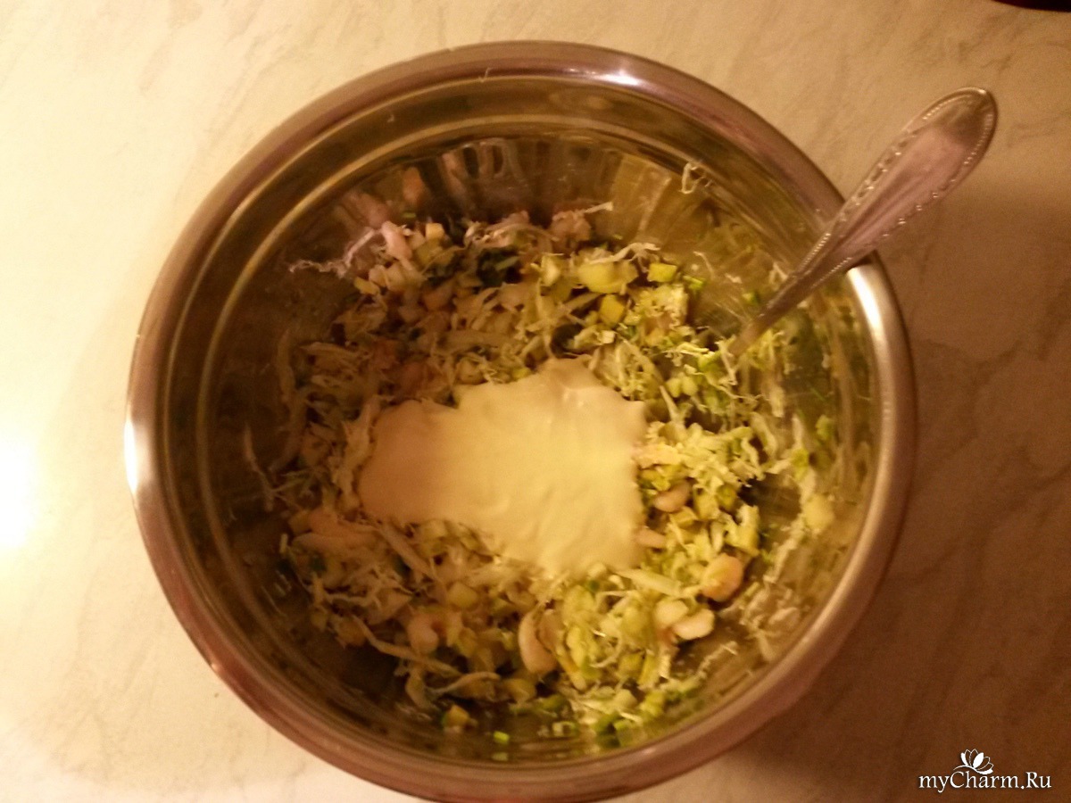 Нежный, легкий салатик с креветкой, необычное сочетание пекинской капусты и зеленого лука, яблока и дижонской горчицы в нежной сметанной пене не оставит равнодушным любителей вкусного и необычного.