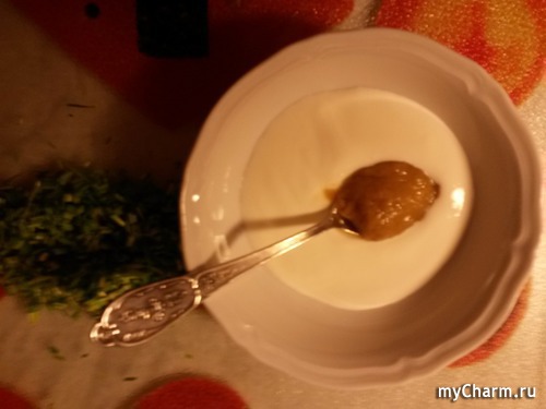 1 чайную ложку горчицы смешиваем со сметаной, добавляем специи, перемешиваем, можно посолить по вкусу.