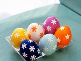 Украсить яйца простыми рисунками, поможет обычная бумага. Вырезайте из нее крошечные звездочки, сердечки, кружочки и цветочки, с помощью клея крепите фигурке к поверхности чистых яиц и опускайте их в емкость с краской. В подкрашенной воде, клей быстро растворится и после высыхания краски бумажки можно будет легко снять.