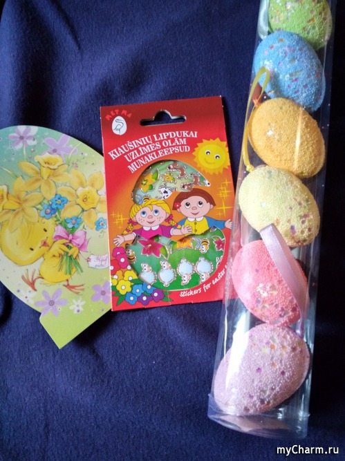 Прекрасная открыточка с пожеланиями от Ниночки, яйца который младший сын развесил по всему дому сразу же и наклейки. Вчера реву было на весь дом из за них. договаривались что мальчишки вместе наклеят их на яйца, но старший решил этим делом заняться единолично, пока младший стал. Симпотишные яйца получились