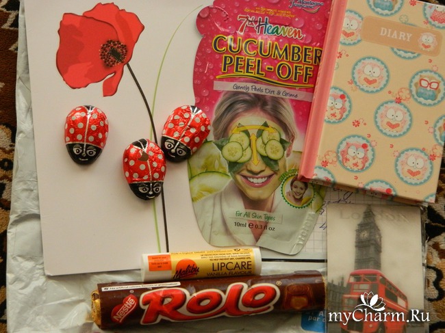 Прелестная открыточка с цветком мака, маска-плёнка для лица, небольшой и очень милый блокнотик, магнитик с видом Лондона, бальзам для губ и вкусняшки - конфетки Nestle Rolo и шоколадные божьи коровки.