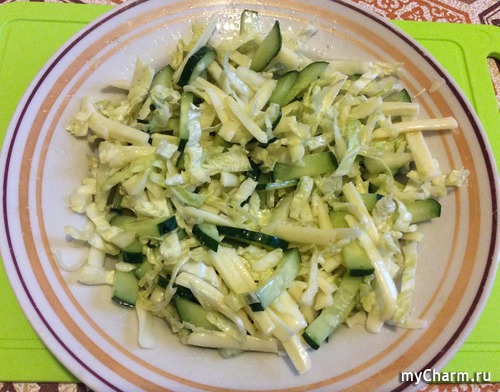 Мелко шинкуем пекинскую капусту. На фото может показаться, что капуста нарезана большими кусками, на самом же деле, капустка порезана очень меленько.