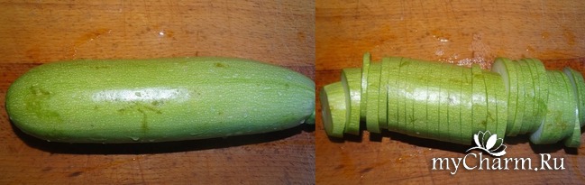 И вот такой маленький кабачок был мною взят для пиццы. Порезала, как и сказано, колечками.