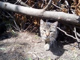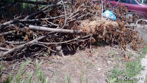 Кто-то свалил на обочину ветки, и под ними кошка вывела котят.