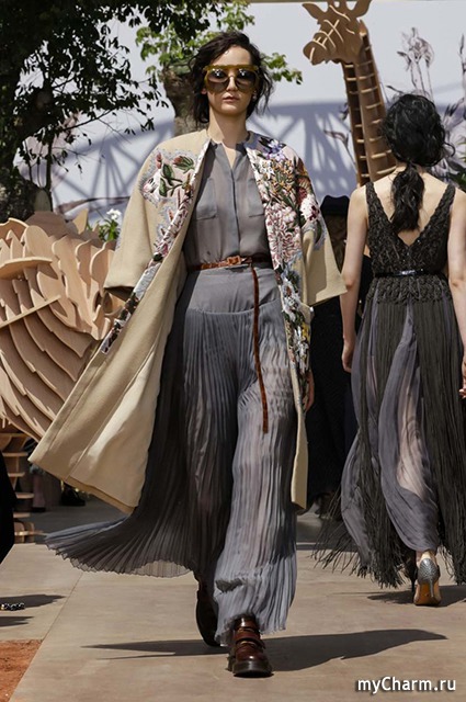 Другие черты коллекции – этнические мотивы, невесомый шелк (а местами даже бархат), дубленая кожа.