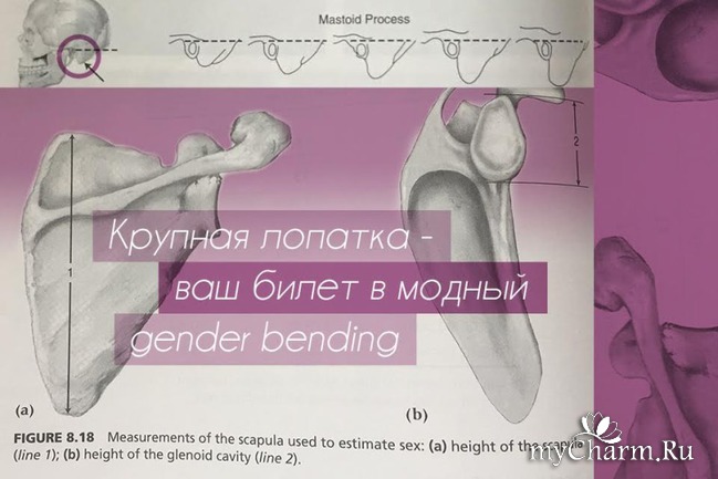 Лопатка содержит в себе яркие характеристики полового диморфизма. До того, как ДНК-анализы научились делать дешево и быстро, в археологии и криминалистике вовсю использовали лопатку для определения пола умершего. Да, думаю, и до сих пор используют, если нужно получить порцию осмысленных данных, а не просто гору цифр. Иногда лопатка способна внести ясность в ситуацию с полом даже если все, что от умершего осталось, это… собственно, лопатка. Для определения пола делается два замера. Первый – это длина лопатки. Все, что от 17 см и больше – мужчина, 14 см и меньше – женщина. Все, что между – недостаточно информации, нужно делать дополнительные замеры. Суставная впадина (glenoid cavity), там, где смыкаются плечо и рука, это следующий маркер. Замеры в 36 мм и больше – мужчина, меньше – женщина. Эти бесстрастные милимметры из леденящих душу криминиальных отчетов гипотетически способны пролить свет на то, какая пройма и горловина вас украсит, а какая – изуродует. И какой вам больше подойдет вырез. Будете ли вы красиво выглядеть в небрежно наброшенном boyfriend-свитерке, как модные блогеры, или не будете. Если суставная впадина сильно меньше 36 мм, то можно качать руки, “как у Мишель Обамы”, до второго пришествия Христа, где сядешь – там и слезешь. Туда же весь плечевой пояс. А уж если миллиметры в суставной впадине позволяют, то будут вам и руки, и плечи, так что и бывший губернатор Калифорнии удивится пределам возможного.