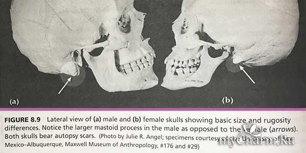 В нижней затылочной части черепа, примерно за ухом, находится сосцевидный отросток. На мужском черепе сосцевидный отросток выступает очень явно (a.), на женском – этот выступ сглажен (b). Главная шейная мышца цепляется за сосцевидный отросток, и от его выраженности ( и еще пары костных бугорков) зависит насколько крепкой и широкой будет шея. По сосцевидному отростку антрополог начнет выстраивать предположения, как выглядели шея и плечевой пояс.