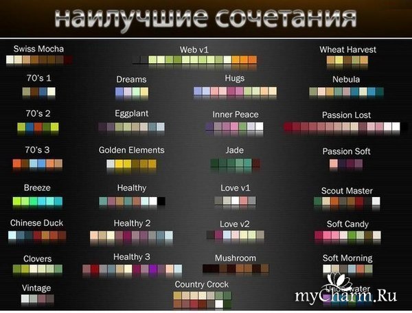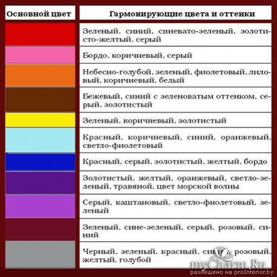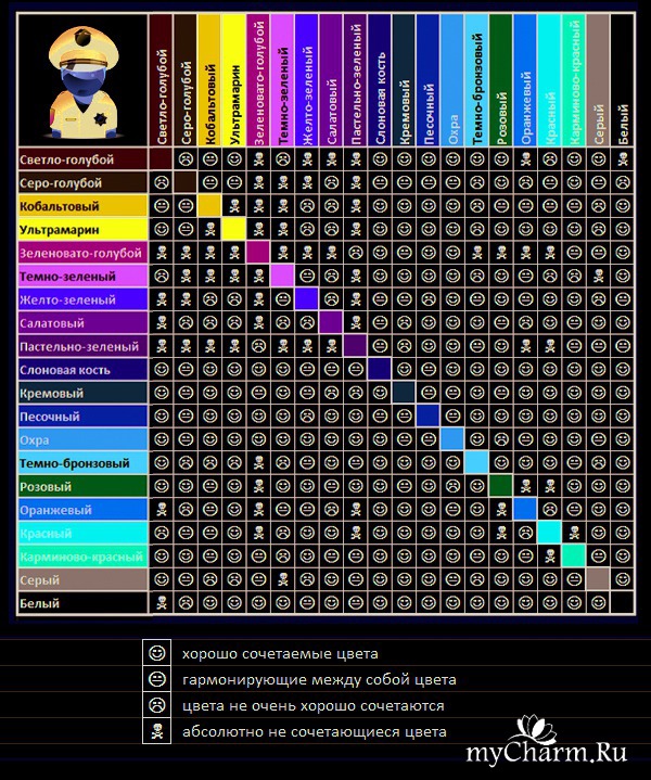 Чтобы облегчить задачу, размещаю таблицы сочетаемости цвета, найденные на просторах интернета.