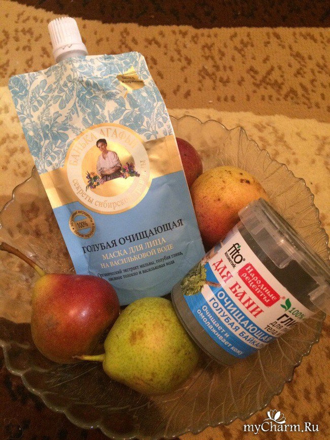 Сегодня мы использовали две разные маски, это - Банька Агафьи "Голубая очищающая маска для лица на васильковой воде" (обзор на нее есть на моей странице) и "Fito косметик, "Глина для лица и волос очищающая". Эти две масочки я пробовала, все мне понравились и дали тот эффект, который я хотела увидеть.