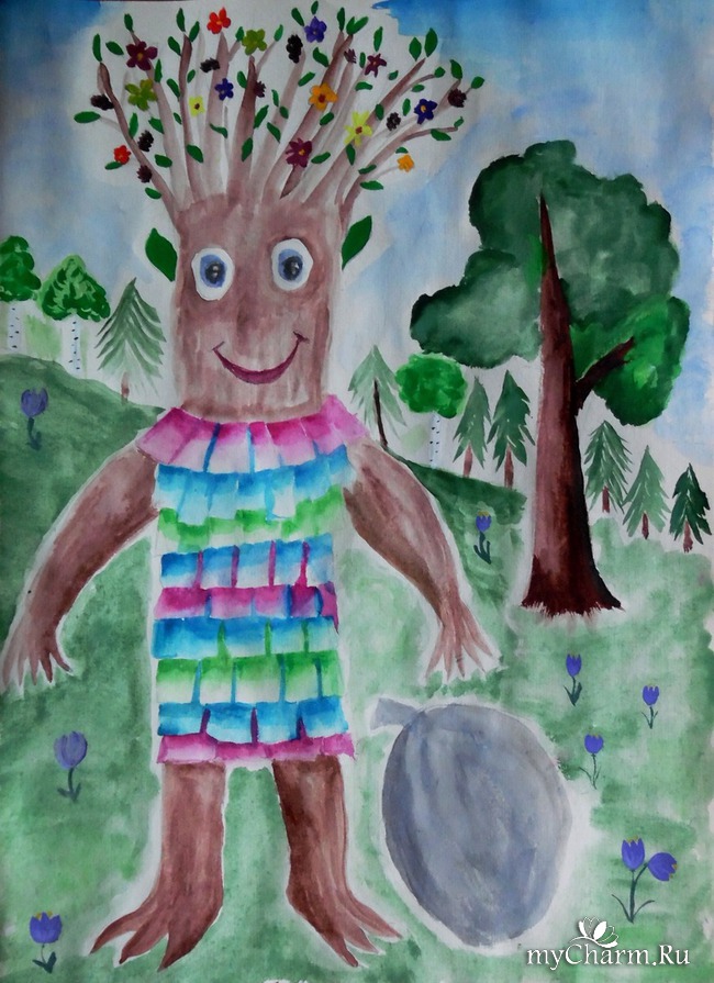 …Вдруг зашумели сосны, засвистел ветер, солнце скрылось за облаком. На лесной поляне появился будто из ниоткуда столб пыли. А когда она рассеялась, то там стоял даже сразу и не скажешь кто. То ли чудо-юдо лесное, то ли ещё кто. Лицо вроде доброе, глаза светятся, руки, ноги на стволы с ветвями похожи, волосы – веточки потоньше, с листиками, цветочками, шишками, а ещё цветами украшены, сделанными из пластиковых бутылок. Одет был лесной гость в блестящий наряд, переливающийся всеми цветами радуги. Пригляделись – а это фантики от конфет, шоколадок. С собой у него был большой мешок.