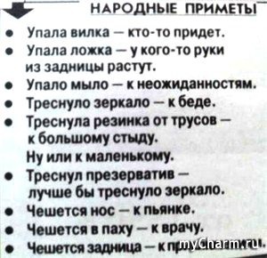 О! я еще одну примету вспомнила. Никогда не проверяла ее, но на всякий случай придерживаюсь