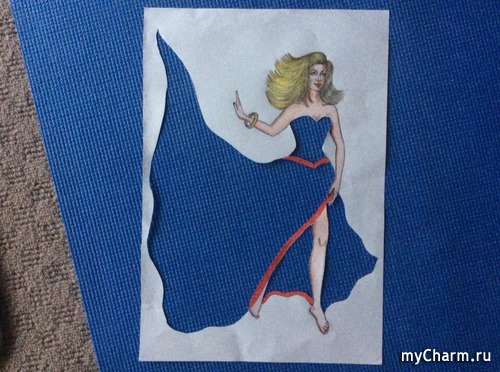 Платье модели создано из рваных кусочков бумажной рукописи. Для меня это символ того загубленного тиража. Но эти рваные обрывки рукописи создают цельный образ красивого, лёгкого, элегантного платья на балерине, которая вдохновенно танцует свой танец. Яркой медью развиваются её волосы, руки распахнутые как крылья в полёте. Это образ мой новой книги.