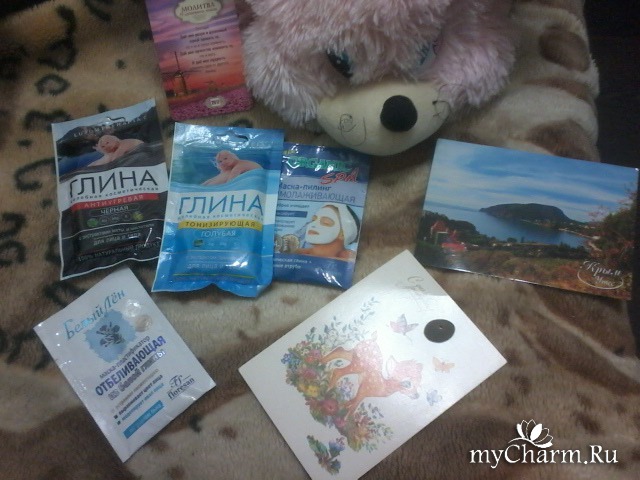 Две чудесные открыточки: одна с днём рождения (та, что с оленёнком) и вторая с крымским утёсом. Вообще обалденная открытка! Календарик с молитвой (супер просто!), тот, что розовенький, стоит у мордочки мышки))), две маски с глиной-голубая и чёрная, маска-пилинг омолаживающая ( ваще, как скину лет 10!) Органик-СПА и маска -пластификатор отбеливающая Белый лён. Тоже из глины, но уже белой. Про такую и не слышала даже!