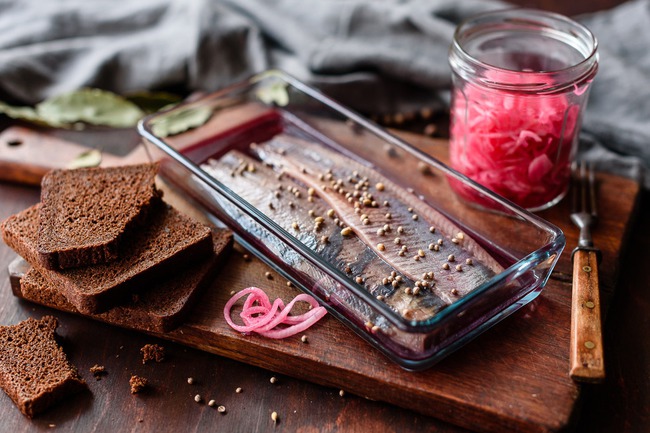 Солёная сельдь (например, засоленная сухим способом) — 2 шт.;