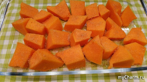 Очищенную тыкву нарезаю кусочками и чуточку сверху посыпаю коричневым сахаром. Можно еще апельсин или лимон(можно и то, и то)кусочками перемешать с тыквой, но сегодня так запекала.