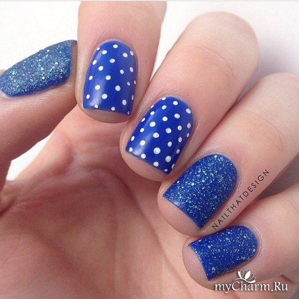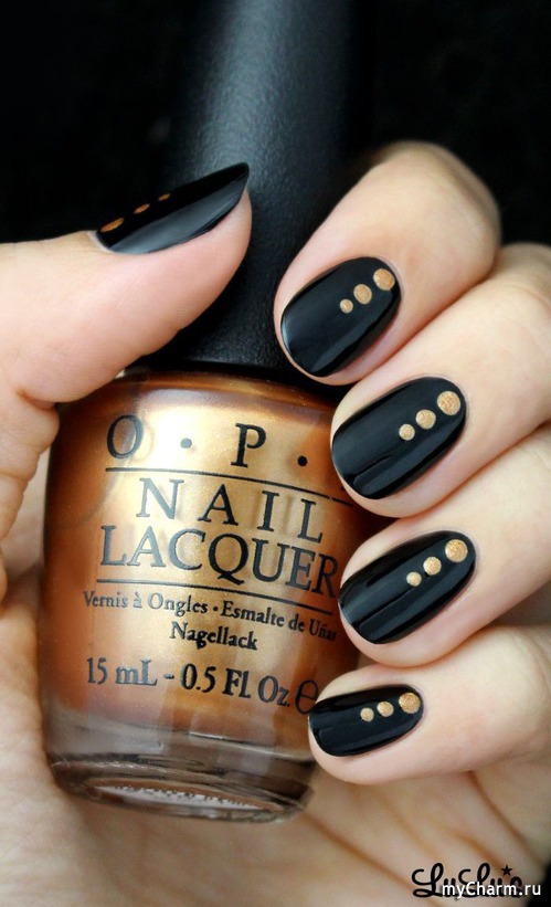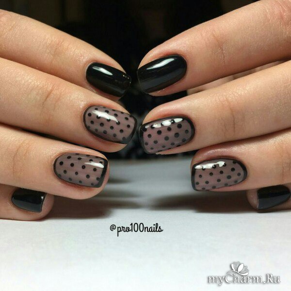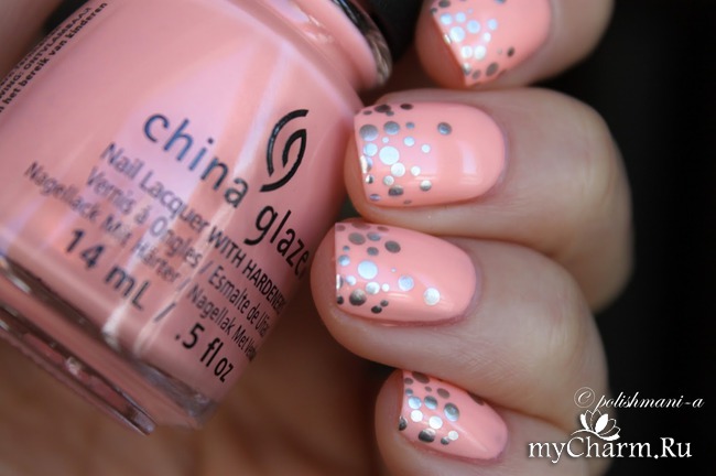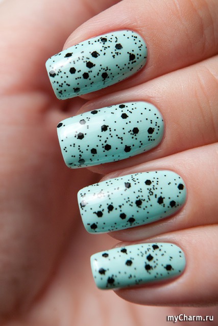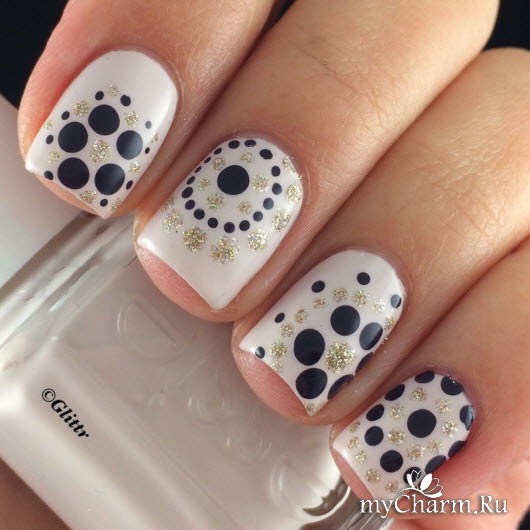 Если уж совсем печалька и ничего путного не выходит у вас, то разрешаются маникюры хотя бы с одной единственной точкой в качестве акцента или можно взять в помощь лаки и топы, в составе которых присутствует глиттер, имитирующий точки.