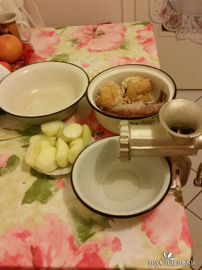 Теперь устанавливаем мясорубку, под решетку ставлю маленькую мисочку и большу миску ставлю рядом, чтобы туда перекладывать прокрученные селедки. Вот как это у меня выглядит: