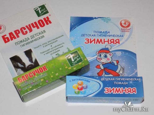 Не знаю, как вы, а я фанат гигиенических помад. Их у меня всегда море, потому что без них – вообще никуда. Губы зимой сохнут – мама не горюй. Так что пословица «готовь сани летом» не работает – сколько я ни питаю губы летом, приходят зимние ветра и холода – и губы становятся сухими за считанные дни. И здесь без отличных гигиеничек не обойтись. Смотрите, какие у меня замечательные – одна «Барсучок» от «7 нот здоровья» и вторая «Зимняя» - с целой радугой витаминов.