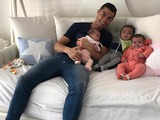 На новой фотографии, которую португальский футболист Криштиану Роналду опубликовал в своем микроблоге, он позирует с младшими детьми - близнецами Евой и Матео, а младшую дочку Алану держит на руках.