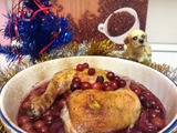 Окорочка на луковой подушке в пикантном вишневом соусе.