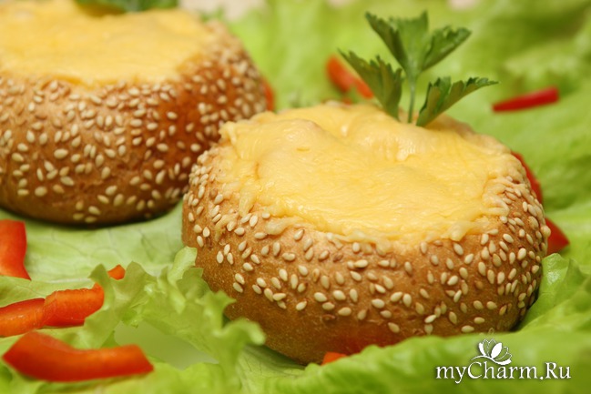 В каждую булочку уложите начинку, сверху посыпьте тертым сыром. Булочки сложите на противень и уберите в хорошо разогретую духовку, до тех пор, пока сыр не расплавится, а булочки не станут румяными.