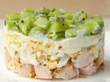 Далее, выкладываем протертое яйцо и смазываем слой майонезом. Дальше, тертый сыр и снова майонез. Сверху, на свой вкус, украсьте салат кусочками киви.
