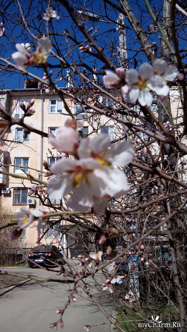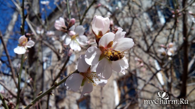 А вот вам цветущий миндаль. Вокруг него роятся пчелки.
