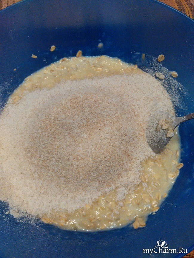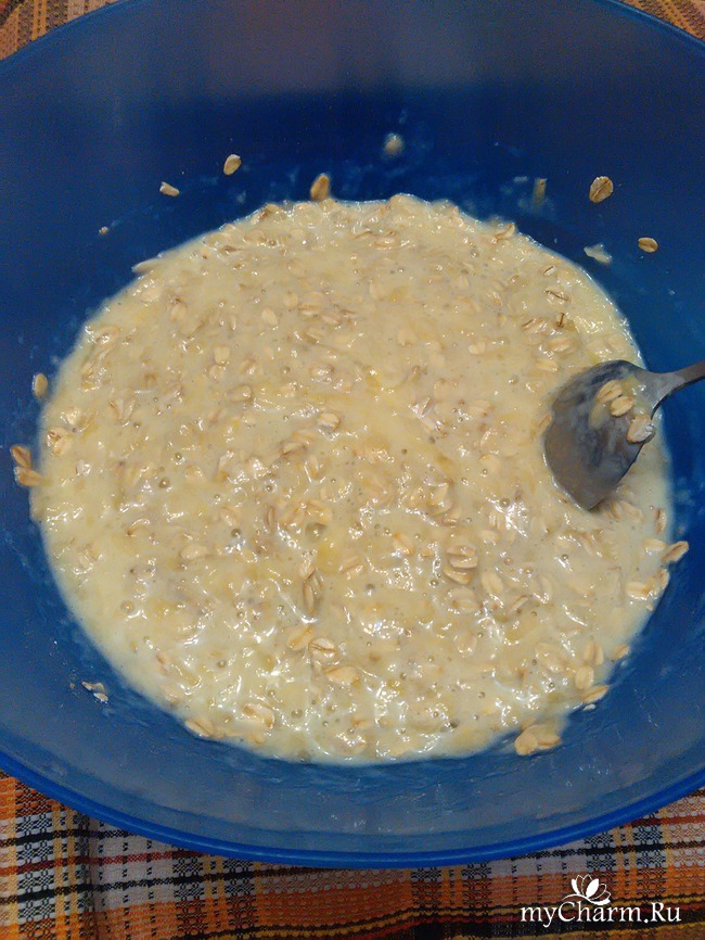 Теперь необходимо добавить овсяные хлопья. У кого нет кухонных весов, 80 гр. хлопьев составляет 6 ст. л. с небольшой горкой. Добавляем в нашу массу и перемешиваем.