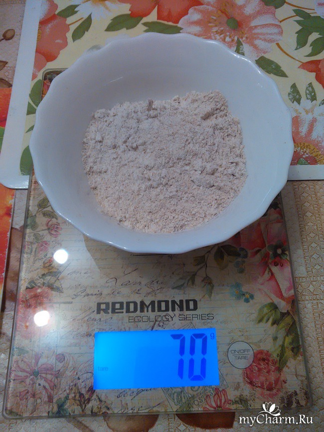 Добавляем муку. У меня получилось 8 ст. л. в 70 гр.. Перемешиваем.