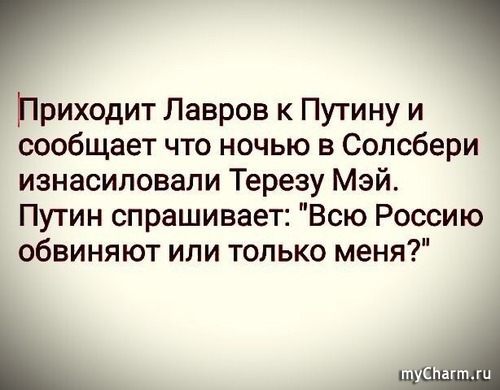 Кошка бросила котят - В этом Путин виноват! Зайку бросила хозяйка - Кто виновен, угадай-ка! Заболела вдруг спина – Это Путина вина! Наша Таня громко плачет - Рядом Путин, не иначе! Свет погас, упал забор, у авто заглох мотор, Зуб здоровый удалили, иль залез в квартиру вор, Не понравилось кино, наступили вы в дерьмо… У любого катаклизма объяснение одно…... Читать полностью |