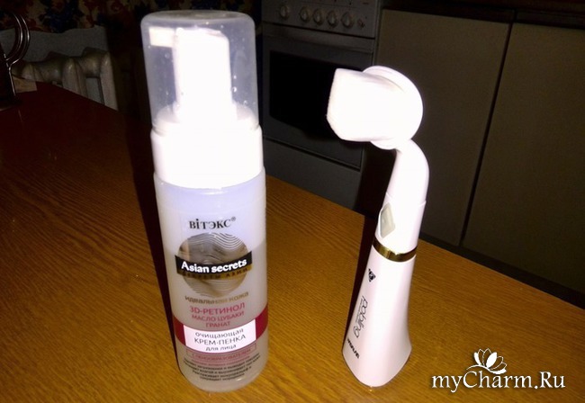 Сначала я умываюсь мицеллярной водой (снимаю макияж), а потом либо гелем либо пенкой смываю остатки загрязнений. Иногда пользуюсь такой вот щеточкой. Очень нравится