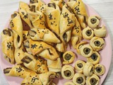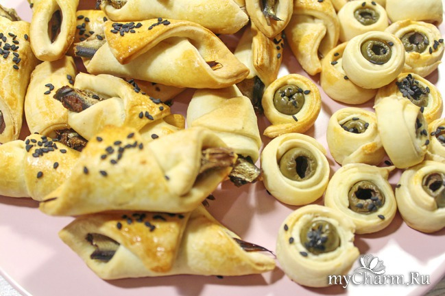 Из того же теста нарезаем тонкие полоски. На каждую положить по 1 оливке и свернуть в рулет.