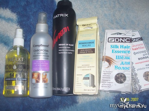 Конечно, не подвели и все остальные средства. Ну и все вы знаете, как я люблю масла и маски от моего любимого ДНЦ! Очень помогли "несмывашки", в частности, мои палочки-выручалочки: пенка Matrix и спреи - от Compliment и Revivor!