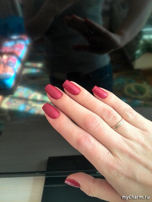 Имеет легкий сахарный эффект. Насыщенно бордовый оттенок и прекрасную голографию.