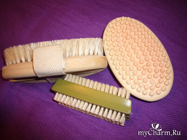 Массаж сухими щетками, скраб, антицеллюлитный гель на проблемные места ( живот, бедра).