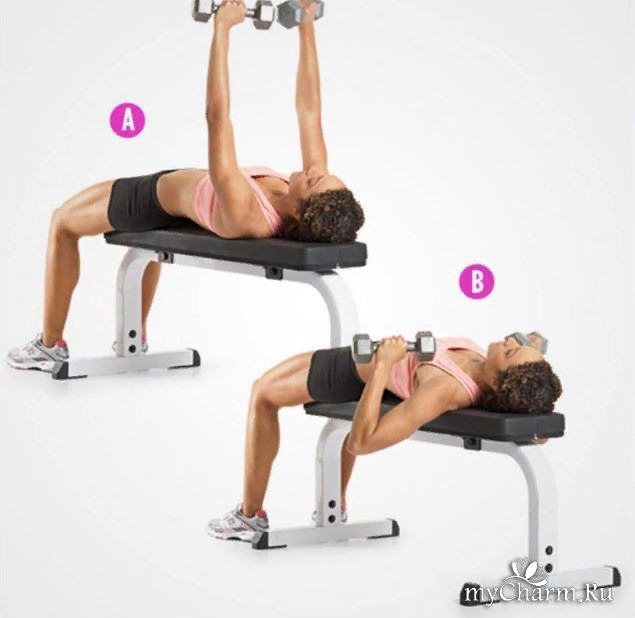 - добавила еще не много нагрузки с гантелями. Упражнения делала лежа на полу или его можно даже делать на кровати. Лежишь смотришь телевизор и поднимаешь гантельки.