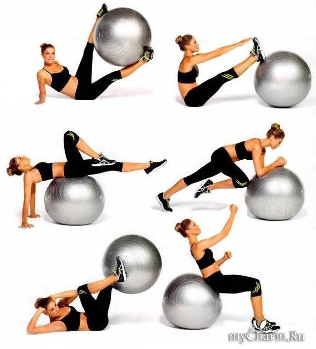 19. 11. Сегодня занималась спортом с фитнес мячом 30 минут. Делала такие упражнения: 1) Обратные скручивания. Необходимо лечь на спину, ноги положить на фитбол по сторонам туловища, обхватить ногами мяч и сильно зажать между икрами. Далее следует напрячь мышцы живота и оторвать бедра от пола и подтянуть колени, как можно ближе к груди.