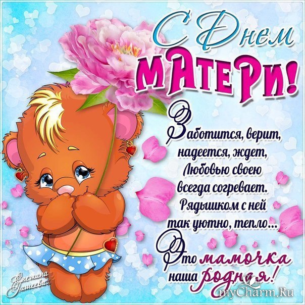 Милые женщины, будьте счастливыми, Мужем и детками, всеми любимыми, И пусть в этот день любимые дети Вам скажут, что нет лучше мамы на свете, И крепко обнимут, по-детски, с любовью! Желаю вам, милые, много здоровья, Пускай все дела чуть-чуть подождут, Себе уделите хоть пару минут! Ведь каждое в вашей жизни мгновение Должно вам всегда приносить наслаждение... Читать полностью |